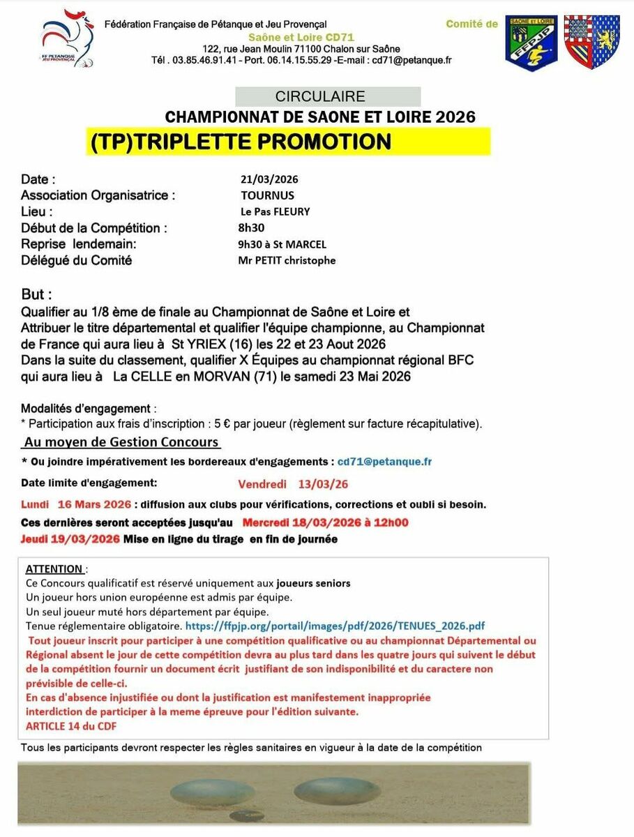 Voici l'affiche du championnat triplettes promotion du samedi 21 mars.